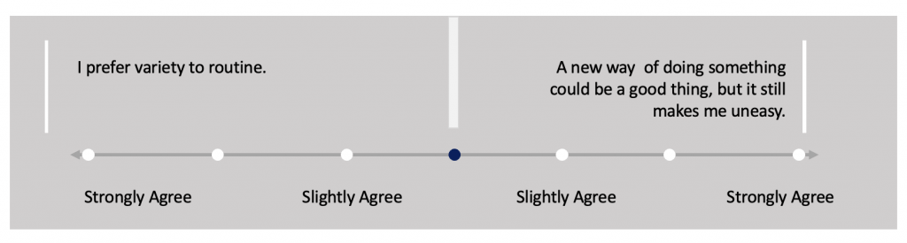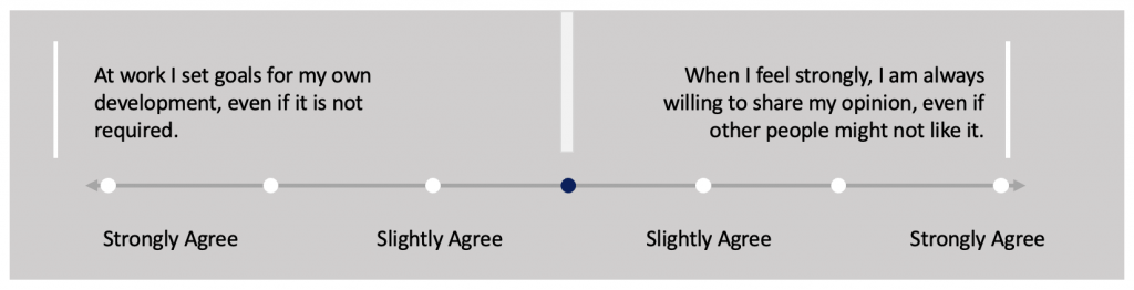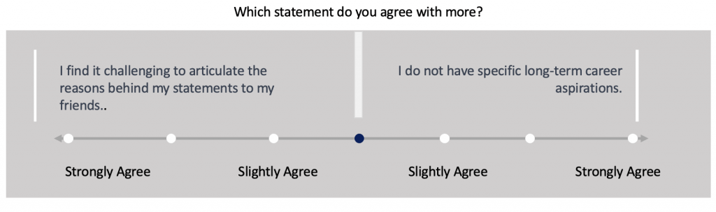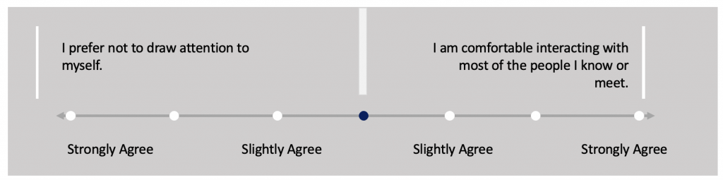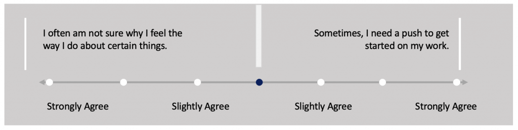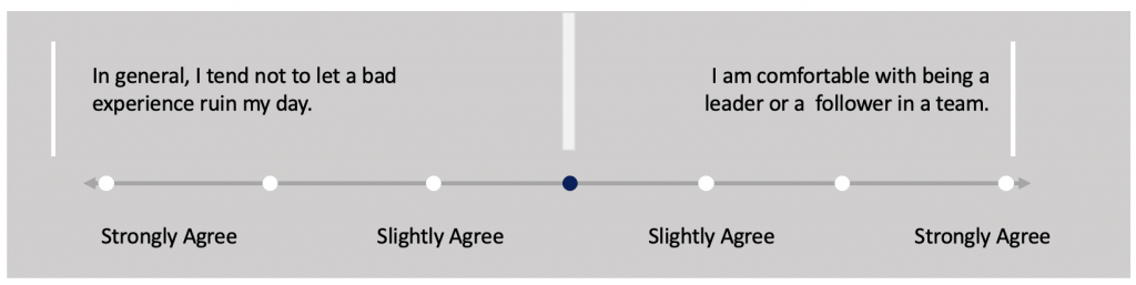 Most questions will ask you to rate agreement on a scale similar to the diagram above. Watch the example below.