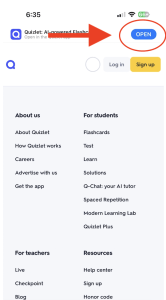 Open your mobile browser and visit the class link. Click the Open button to view it in the Quizlet app.